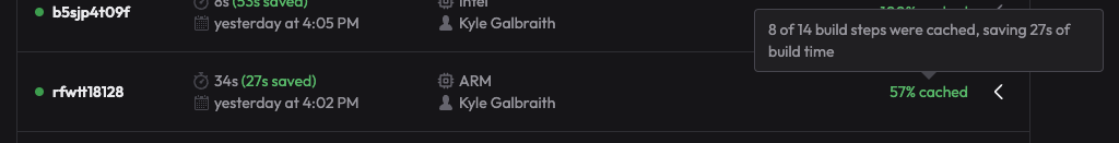 When you hover over the cache percentage, we show you the count of how many steps of your build were cached versus uncached.
