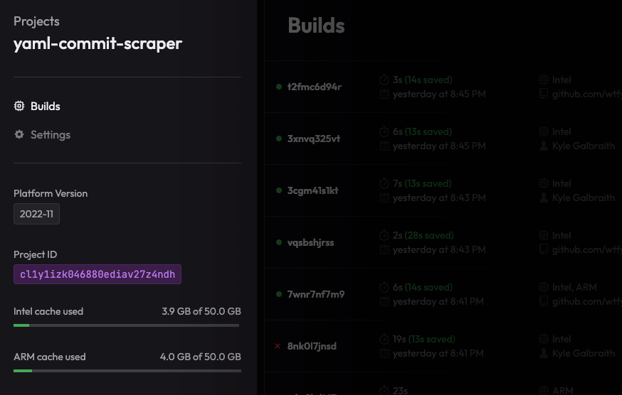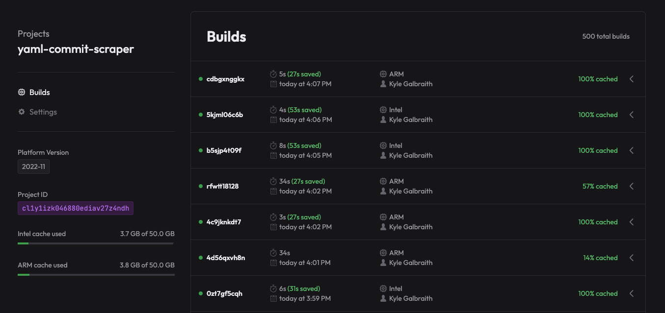 Lastly, we've added the ability to see how much of your cache space you have used for both Intel and Arm. Behind the scenes, we automatically evict old cache on a garbage collection loop, but it's still helpful to know how much of your cache space you are actually using.