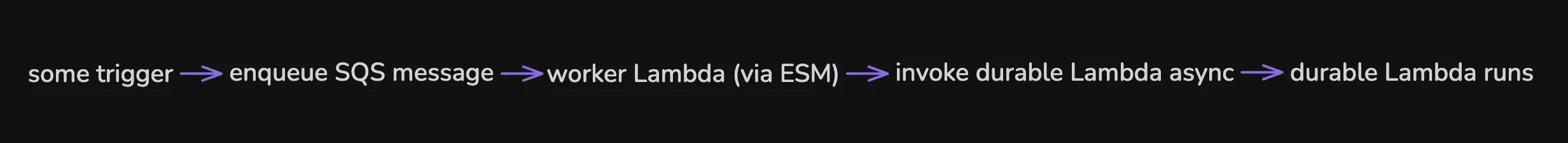 We have a dedicated task whose job is simply to invoke the durable Lambda asynchronously by specifying InvocationType: 'Event'. It completes quickly and returns, which satisfies the event source mapping, and the SQS message is acknowledged while allowing the durable function to run independently for as long as needed. The DurableExecutionName is critical for idempotency. If SQS delivers the message twice and the worker Lambda fires twice, AWS won't create a duplicate execution.