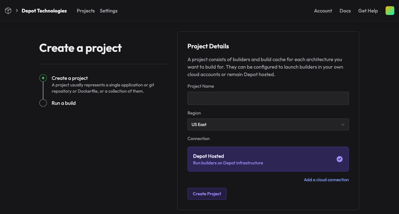 For Depot-hosted projects, you can select between our US East and EU Central regions. Then, when a build is routed to that project via either our depot build CLI or depot/build-push-action in GitHub Actions, we will route the build to a builder in that region.