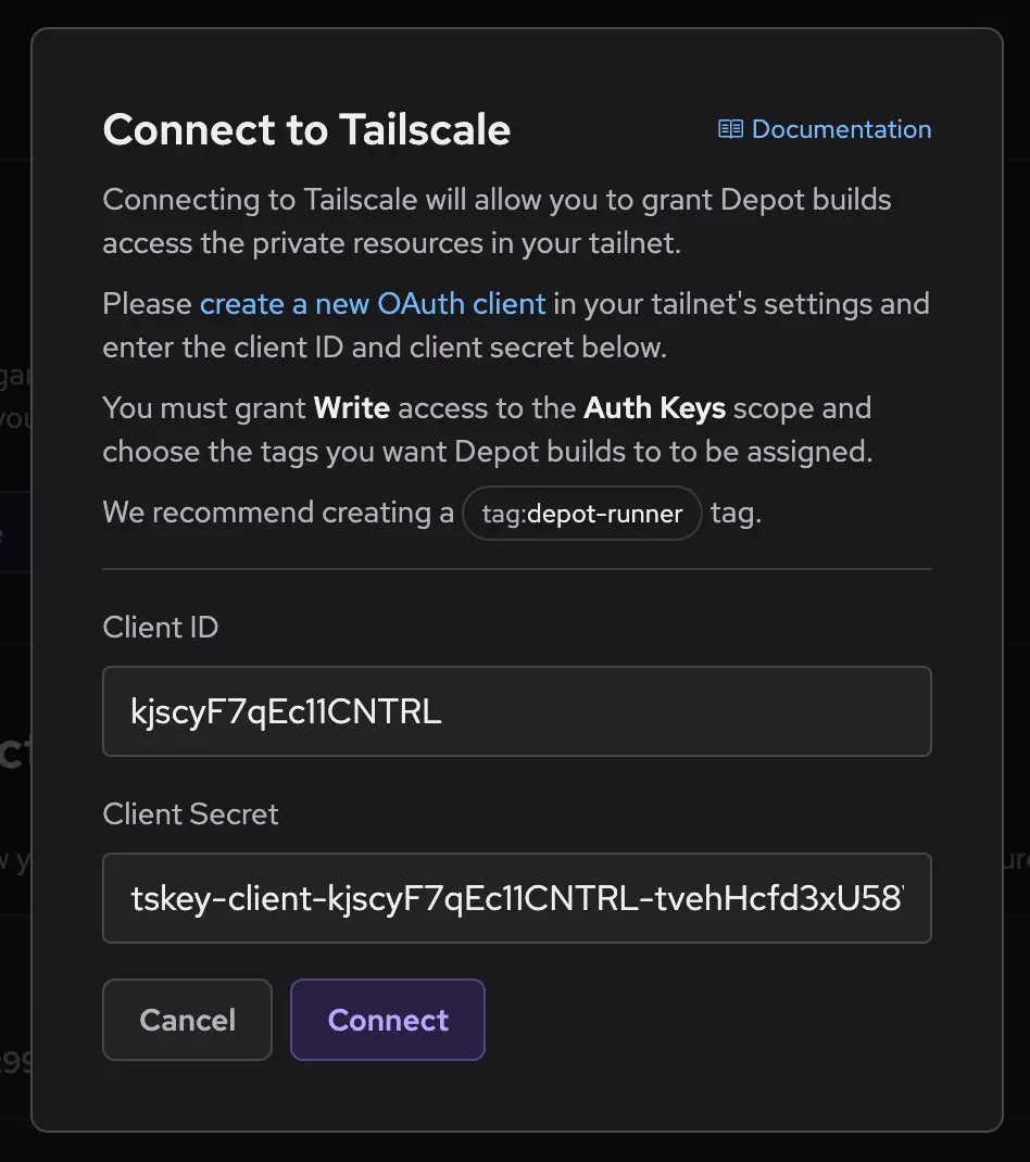 Finally, you will need to configure your Depot organization to use the new OAuth client credentials. From your organization settings page, navigate to the Tailscale section and click Connect to Tailscale. Enter the client ID and secret from the previous step and click Connect: