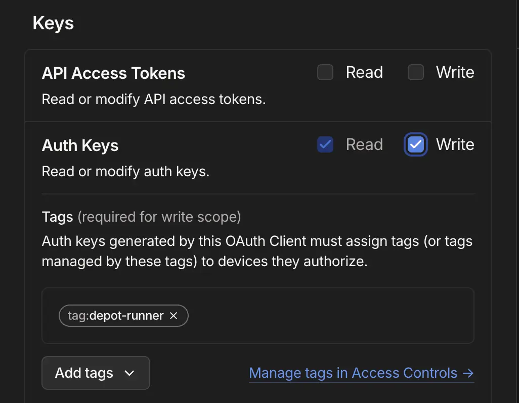 }Next, generate a new OAuth client from your tailnet's settings. This client can be given a descriptive name and should be granted Write access to the Keys > Auth Keys scope. You should select the tag you created in the previous step as chosen tag for this scope: