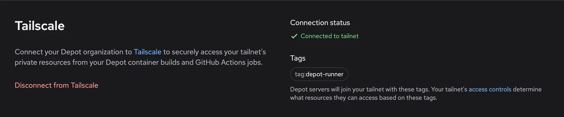 }If you wish to disconnect your Depot organization from Tailscale, navigate to the Tailscale section in your organization settings and click Disconnect from Tailscale. This will remove the OAuth client credentials from your organization and your Depot runners will no longer join your tailnet as ephemeral nodes: