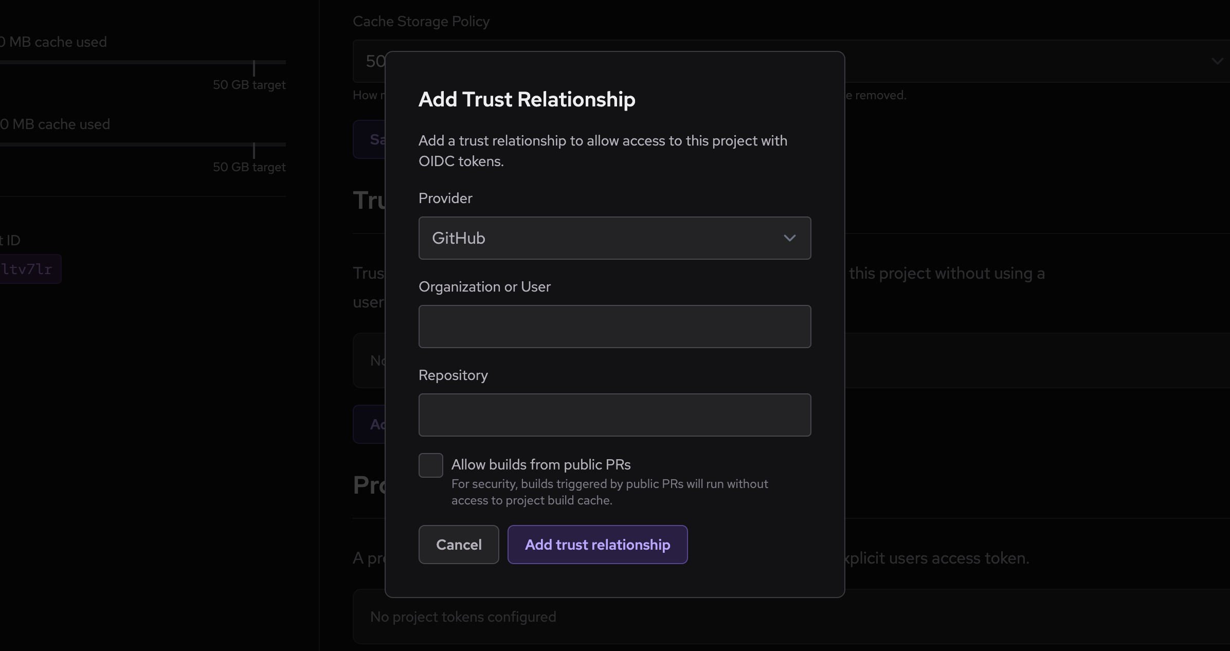 Each Depot project can be configured to allow builds from specific repositories, then the CLI will automatically authenticate using a GitHub Actions OIDC token exchange: